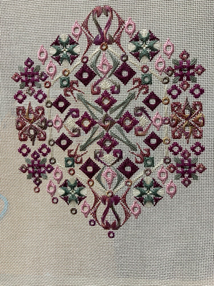 This group of stitchers began participating in a Peppermint Purple blackwork stitch-a-long via Zoom meetings early in 2021. For more information about Peppermint Purple and blackwork, follow this link. Stitch-a-longs are great fun as they are completed one small piece at a time throughout a year. Since then, members have tried other blackwork stitchalongs as well as blackwork projects from a variety of sources.